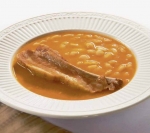 400 g belega fižola 400 g bele čebule 400 g prekajenih rebrc 8 strokov česna 1 lovorov list sol nekaj zrn popra 2 žlički sladke mlete paprike 1 žlička paradižnikove mezge feferon ali ostra mleta paprika (po želji) 1 poravnana žlica moke
