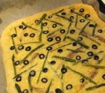 Testo razvaljamo na velikost pekača. Položimo ga na naoljen pekač, robove zadebelimo. Testo pomažemo z olivno pasto in obložimo s čebulo, inčunovimi fileji in žajbljevimi lističi.