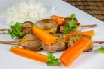 Meso osušimo in narežemo na kose. Kose napičimo na leseno paličico. Meso solimo, popramo in na hitro popečemo na vročem olju.