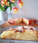 Jabolka olupite in jih na tanko narežite z mandolino (rezalnikom). Preložite jih v skledo, prelijte z limoninim sokom in postavite na stran. Testo pripravite tako, da najprej stepete jajca s sladkorjem, nato pa dodate naribano limonino lupinico in sol.