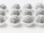 350 g čokoladnega biskvita (iz zgornjih sestavin) 180 g mascarpone sira 2 rumova sladkorja 110 g sladke smetane 55 g nutelle kokosova moka (za valjanje)