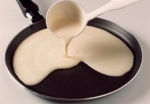 Nato med nenehnim mešanjem v tankem curku v skledo počasi vlivamo preostalo mleko. Ko prilijemo vse mleko in dobimo gladko in tekoče testo, prenehamo z mešanjem. Masa mora biti tekoča, vendar ne sme biti vodena. Če je vodena, dodamo še malo moke.