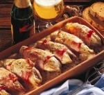 Pečeno cikorijo prerežemo na pol in eno polovico napolnimo z mesno omako (del prihranimo), pokrijemo z drugo polovico in vse skupaj zavijemo v rezino kuhane šunke. Ostanek mesne omake zlijemo v pekač, naložimo vanj še ovito cikorijo in prelijemo s sirom, ki smo ga zmešali z rumenjakom.