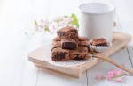 Ko se kolač ohladi, odstranite papir. Segrejte nož in z njim poravnajte robove kolača, da dobite lepo obliko. Nato ga narežite na približno 2,5 cm velike kocke. Pred vsakim rezanjem nož ponovno segrejte. Na koncu s pomočjo cedila posujte kakav preko narezanih kock.