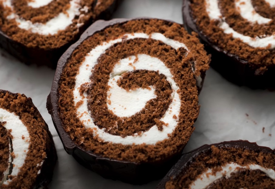 Popolnoma rahla in puhasta čokoladna rolada, napolnjena z vaniljevo stepeno smetano in oblita z bogatim čokoladnim ganachejem. Ta sladica je odličen zaključek vsakega obroka.