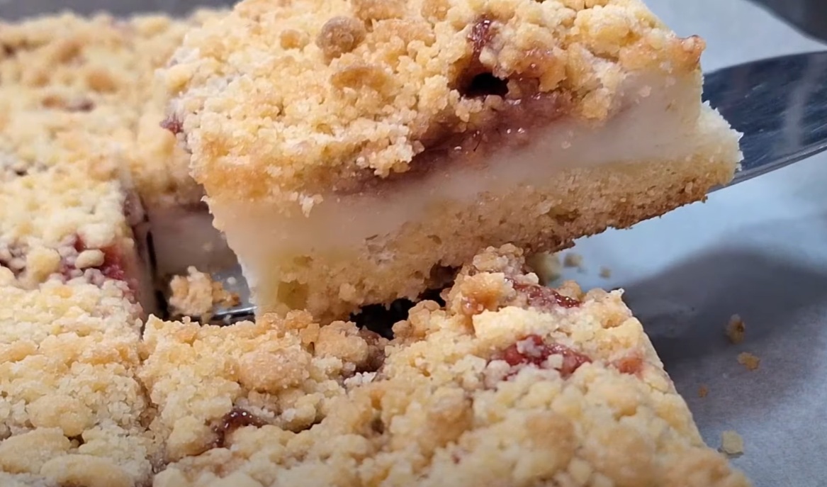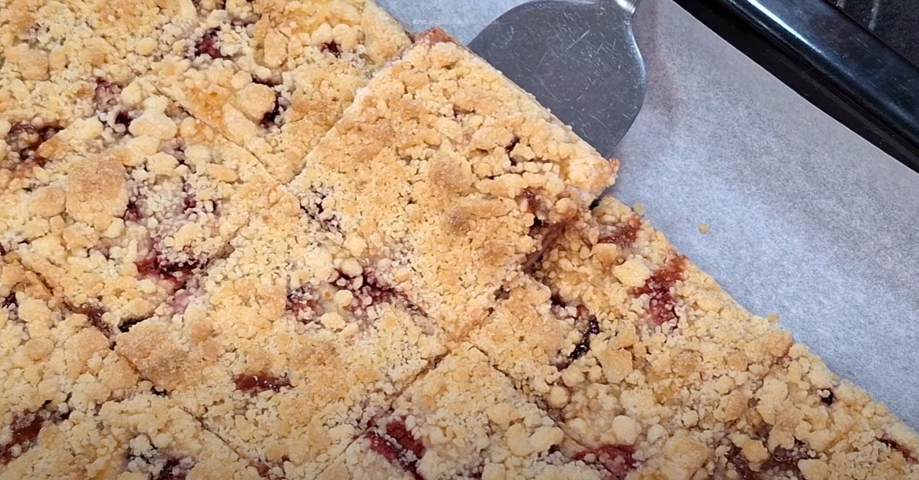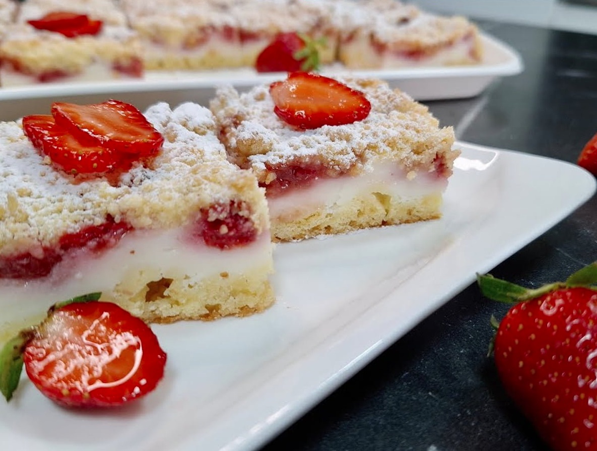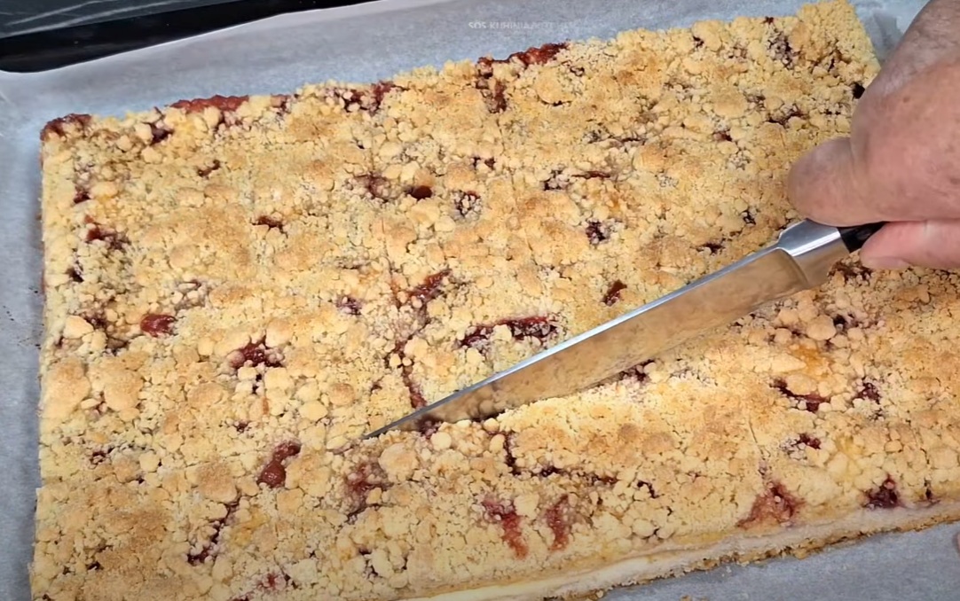 Preko testa prelijemo kremo in posujemo z jagodami. Po vrhu dodamo še jagodno marmelado in potrosimo preostanek testa. Pečemo do 45 minut.