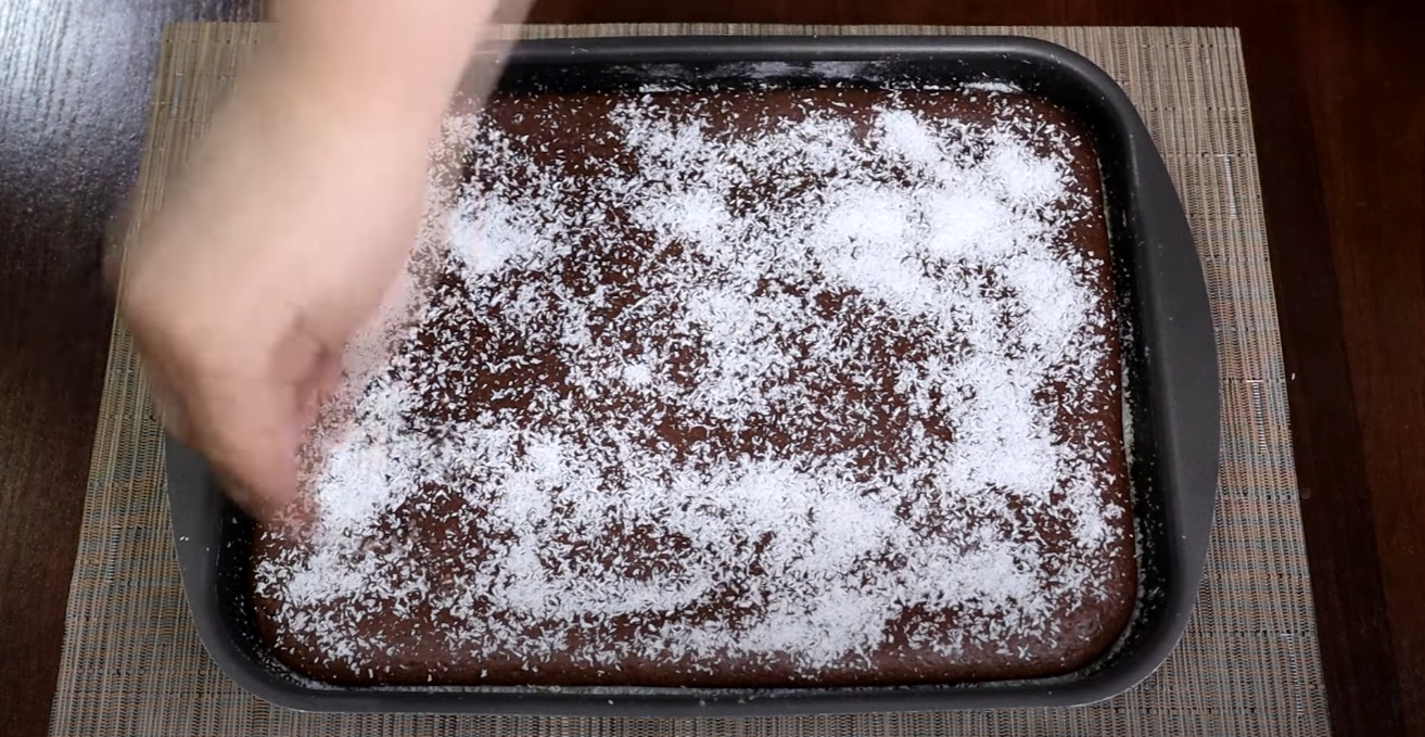 Pečen kolač pustite, da se ohladi, nato pa ga posujte s kokosovo moko za še bolj intenziven kokosov okus.