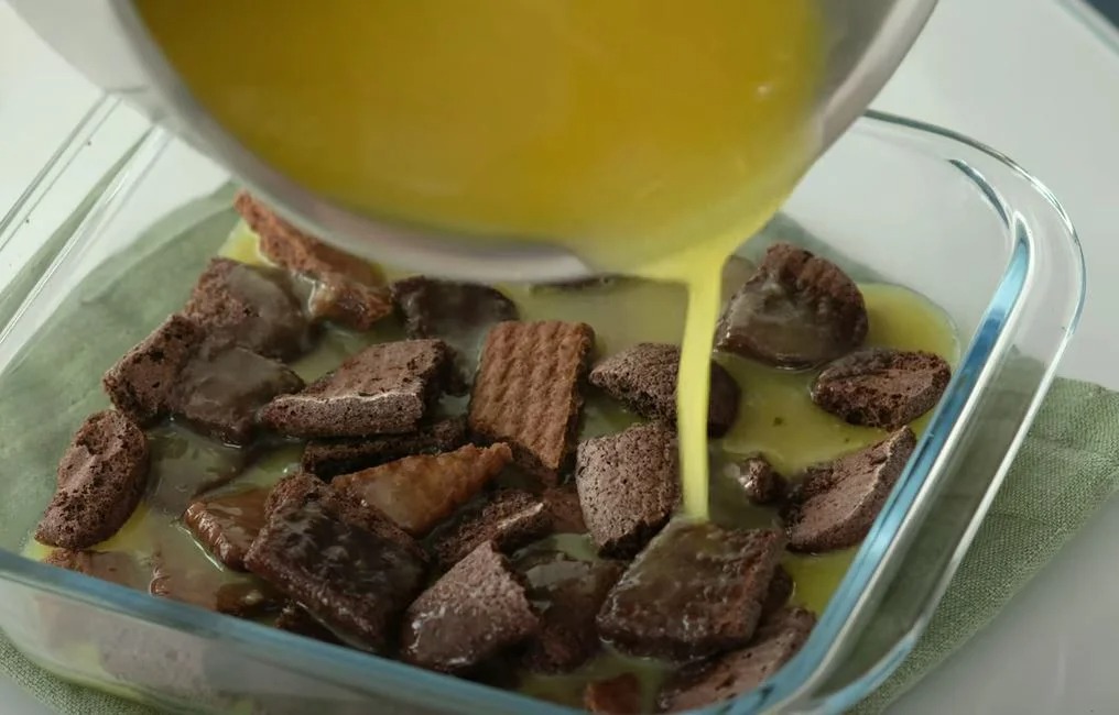 Ko je zmes pripravljena, jo damo na stran, da se malo ohladi. Piškote nalomimo v pekač 16 x 16 cm.