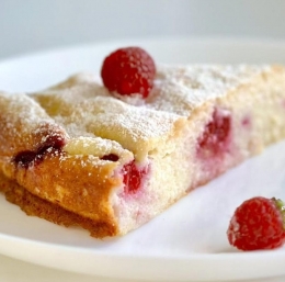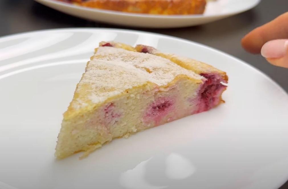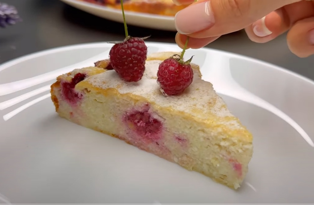 skuta 400 g, jogurt 100 g, 2 jajci, sol, sladilo 4 žlice ovsenih kosmičev, 1 čajna žlička pecilnega praška, 100 g malin (breskev, sliva, hruška, banana).