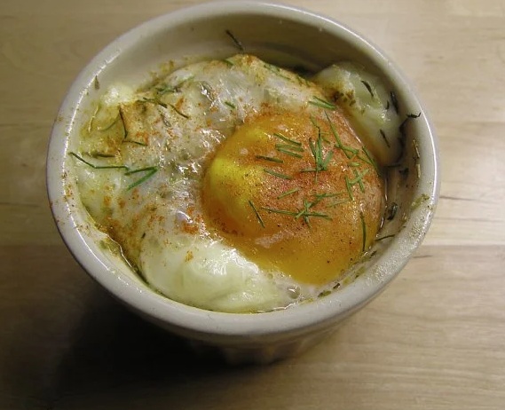 Jajce na oko v ramekinu, s šunko, sirom in zelišči