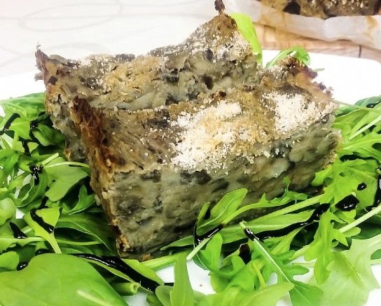1 kg melancan (3 srednje melancane) 500 g krompirja 50 g čičerikine moke 1 čebula 2 veliki žlici veganskih drobtinic majaron za okus olivno olje sol 1 velika žlica sojine smetane za kuhanje rukola in balzamični kis