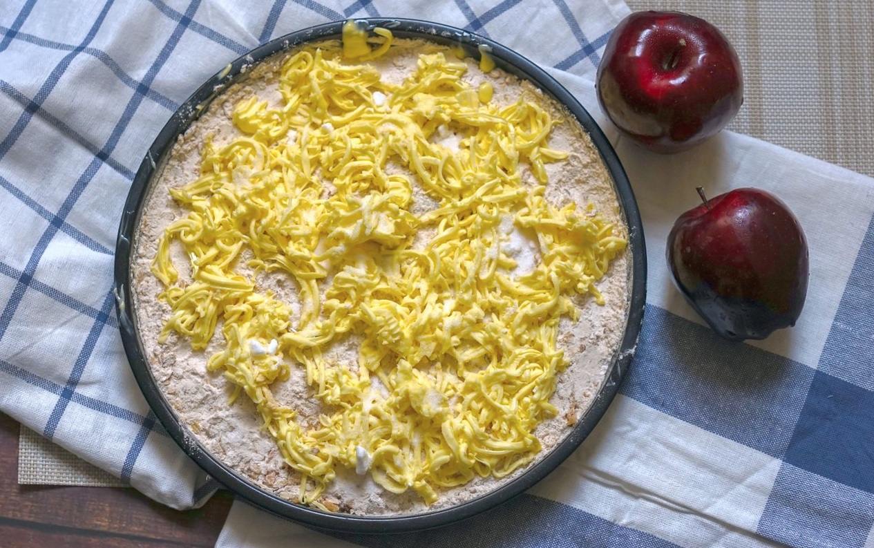 PostopekZa pripravo peciva lahko uporabimo okrogel pekač, premera 22–23 centimetrov, ali pa manjši pravokoten pekač, velikosti približno 20 x 30 centimetrov. V večjo skledo dodamo vse suhe sestavine (ovsene kosmiče, moko, sladkor, mleti cimet) in jih dobro premešamo. Jabolka operemo in olupimo. Naribamo jih v skledo in prelijemo z limoninim sokom. Dobro premešamo in postavimo na stran. Dno pekača, ki ga bomo uporabili, rahlo namastimo z maslom in obložimo s papirjem za peko. Vanj grobo naribamo približno 25 g hladnega masla in ga enakomerno razporedimo po dnu. Po maslu potrosimo 3–4 žlice suhe mešanice. S hrbtno stranjo žlice jo enakomerno razporedimo po celotni površini. Nato v pekač dodamo tretjino naribanih jabolk, ki jih ne ožamemo. Razporedimo jih tako, da z njimi v celoti prekrijemo suhe sestavine. Na jabolka nanesemo tretjino preostale mešanice suhih sestavin. Sledi nova plast jabolk in postopek nadaljujemo, dokler nam ne zmanjka sestavin. Na vrhu mora biti mešanica suhih sestavin, po kateri naribamo preostalih 115 g hladnega masla. Če želimo, na koncu po vrhu potrosimo še 1–2 žlici sladkorja. Pecivo pečemo v pečici, ogreti na 180 stopinj Celzija, 35–40 minut. Pečeno je, ko se po vrhu zlato rjavo zapeče. Preden pecivo narežemo na kose, ga pustimo počivati 20 minut. Postrežemo s kupčkom stepene smetane ali grškega jogurta.
