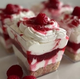 Zdrobimo piškote in jih damo na dnu lončka. Dodamo plast smetane, malinin pire in znova plast smetane. Na koncu dekoriramo po želji.