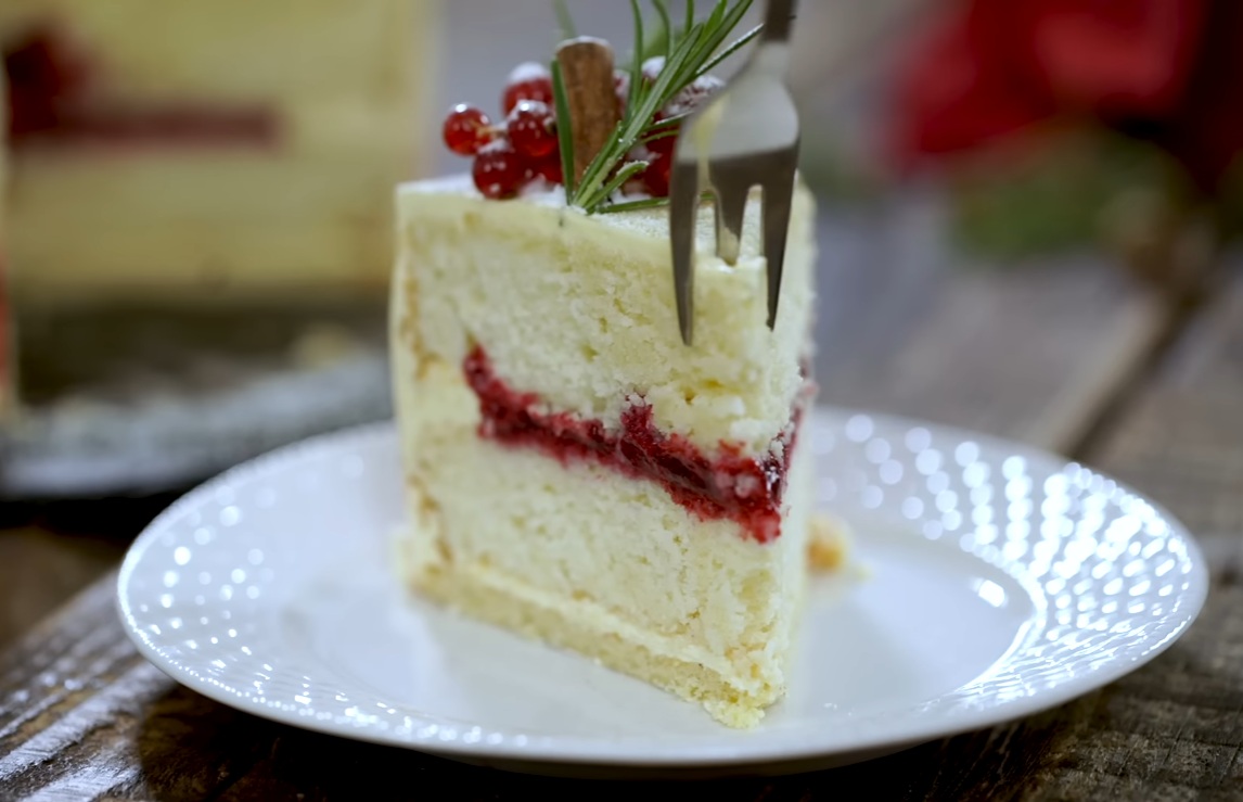Ko se torta ohladi, nadaljujemo z okraševanjem. Torto lepo premažemo z masleno kremo, da so gladki robovi in ni videti sledov noža. Uporabimo rdečo barvo za živila, ki jo s čopičem nanesemo na spodnji del torte (glejte video). Ob stiku torte in podstavka nabrizgamo kroglice maslene kreme. Na vrhu v krogu damo sveže maline in ribez ter vejice rožmarina. Posujemo s sladkorjem v prahu, da dobimo videz snega.