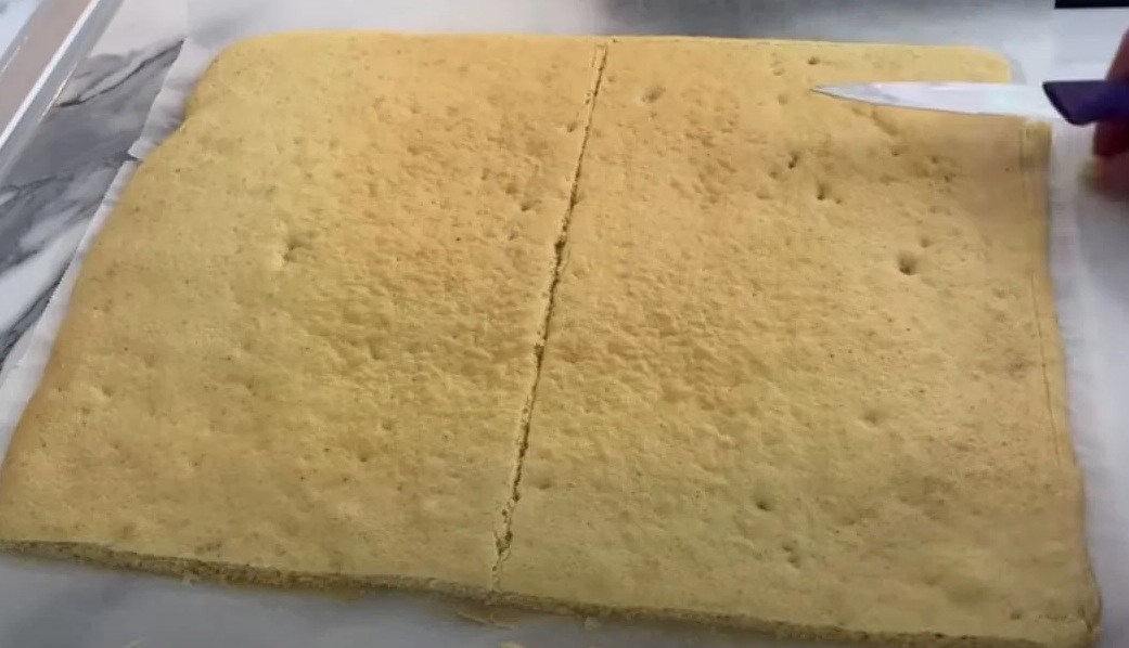 Ko je biskvit pečen, ga odstranimo iz peki papirja in prerežemo na pol, da dobimo dve enaki polovici.