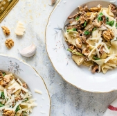 Široki rezanci z gobami, parmezanom in orehi