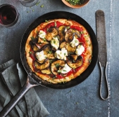 Poletna pica v ponvi z jajčevci, skuto in meto