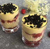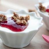 Puding s kokosom in vrtnicami ter prelivom iz ribezovega sirupa